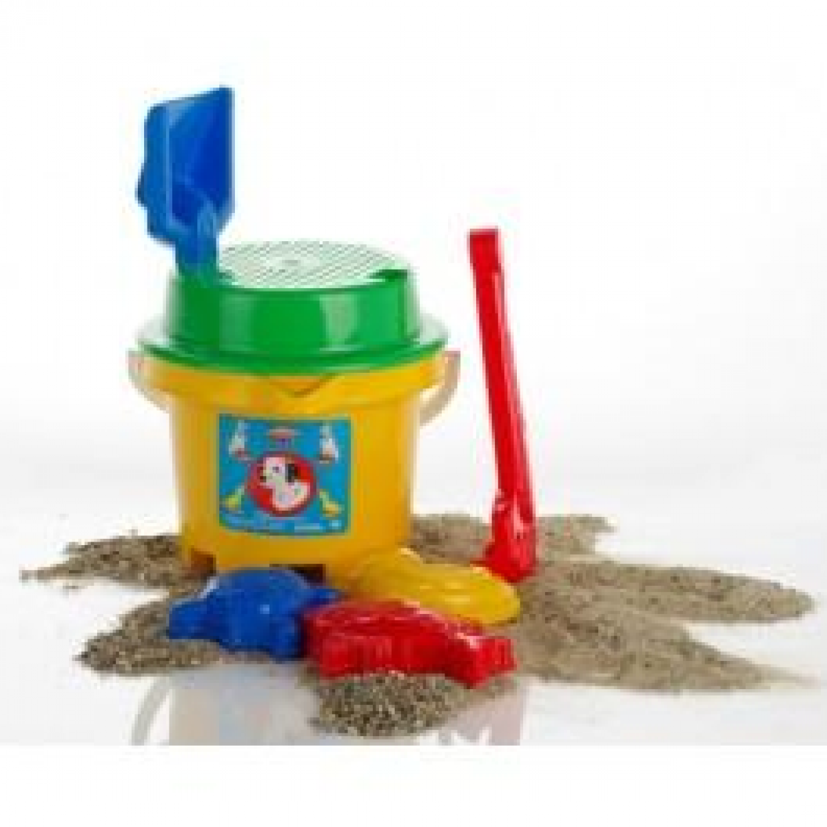 В наборе: ведерко, крышка — сито, лопатка, грабли и формочки для песка
