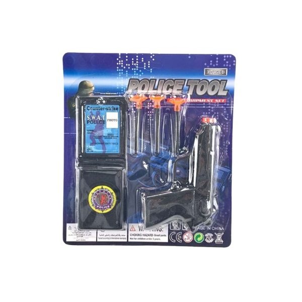 Include – arma, cătușe, insignă de polițist, certificat, 3 săgeți cu ventuze.