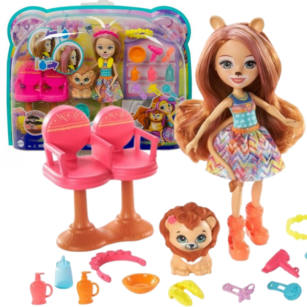 [:ru_RU]Встречайте Enchantimals – компанию очаровательных девочек, имеющих особую связь со своими лучшими друзьями-зверушками. В набор “Салон красоты” Enchantimals из серии “Солнечная саванна” входит кукла Львица Лейси и львенок Манеси, а также 12 веселых аксессуаров – все, что нужно для р-р-роскошного перевоплощения! Еще больше развлечений ждет вас с друзьями-львятами и двухместными креслами в салоне красоты.