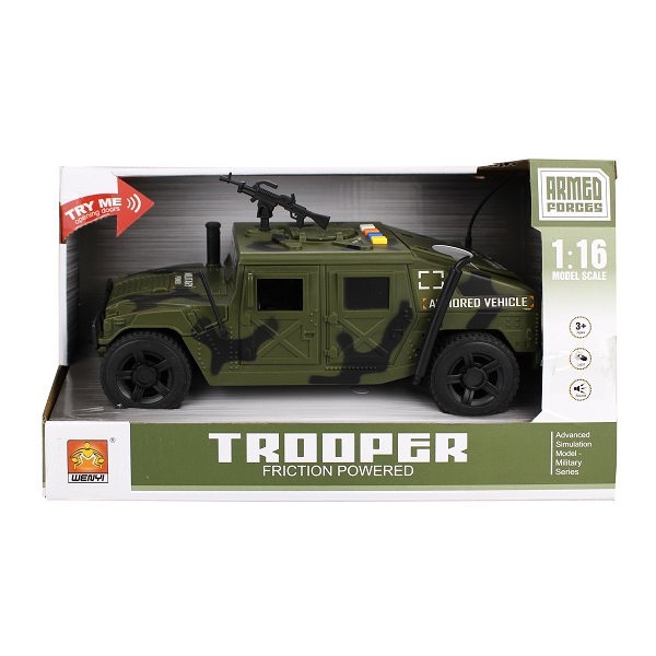 [:ru_RU]Инерционная военная машина — это копия настоящего автомобиля с прочным корпусом. Такая игрушка понравится юному автолюбителю. Транспортное средство дополнено световыми и звуковыми эффектами, активировать которые можно нажатием кнопки на корпусе, что придает игровому процессу эффект реалистичности.  Реалистичный дизайн машинки позволит с головой погрузиться в игру, отправиться навстречу приключениям.