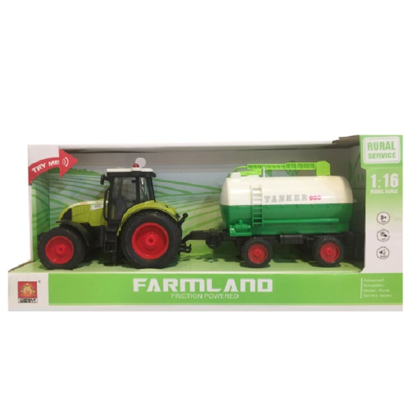 Copilul dumneavoastră poate să se joace în siguranță, punând imaginația în lucru și să fie un șofer de tractor pentru a dezvolta abiliitățile unui bun fermier. Formele speciale și culorile vii încurajează copilul să exerseze și să se joace, stimulând astfel dezvoltarea individuală. Execuția robustă și culorile vibrante vor atrage cu siguranță atenția și curiozitatea oricărui copil. Acestea reprezintă replici fidele ale utilajelor utilizate în realitate de către marii agricultori, tractoarele emit sunete și lumini de atenționare. Sunetele specifice pot fi acționate prin butoanele plasate deasupra cabinei. Roțile sunt de cauciuc. Remorca specială este proiectată pentru lucrările agricole și este echipată cu elemente mobile. Tractoarele din seria „Trailered Farm Tractor” sunt fabricate din material plastic de înaltă calitate. Tractorul este construit la o scara de 1:16. Jucăria este dotată cu motor cu fricțiune, astfel, ea va fi împinsă puțin și datorită fricțiunii ea se va deplasa o mare distanță pe direcția