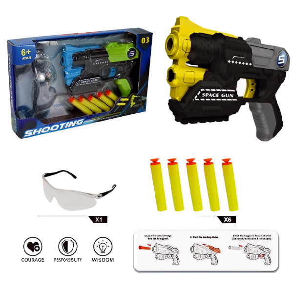 Комплектность: бластер – 1 шт, защитные очки – 1 пара, мягкие пули – 5 шт.