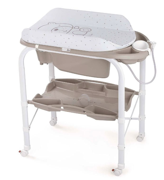 Столик для пеленания с мягким матрасиком с системой предотвращения падения, ванночка имеет два нескользящих сиденья: наклоненное сиденье для малышей 0-6 мес, и второе с подлокотниками – для малышей постарше от 6 до 12, отделение для губки и мыла, заглушка и шланг для слива воды, ящик для аксессуаров, 4 колесика (2 с тормозами), идеально для небольших ванных комнат.