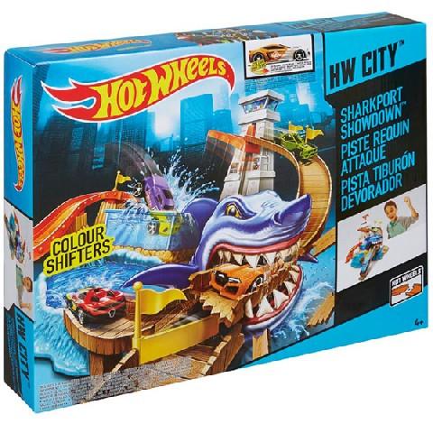 Трек “Охота на акулу”– это трек Hot Wheels с двумя бассейнами, холодной и горячей водой, попадая в который машинка может изменять свой цвет, в зависимости от температуры.