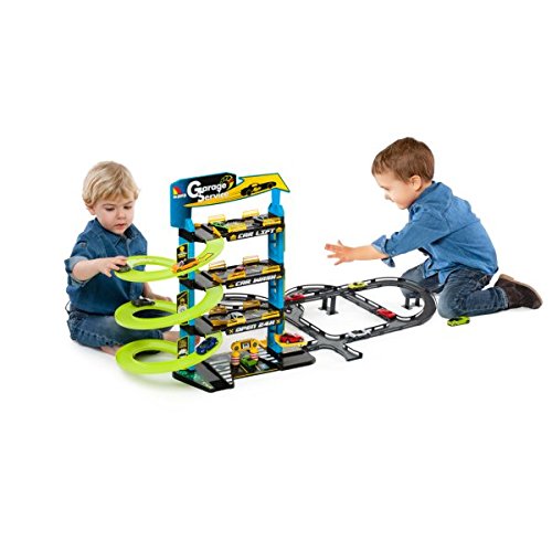 Cu o baza ferma, stabila si usor de asamblat, cutia contine piese si accesorii cu ajutorul carora copiii pot construi o parcare cu 3 niveluri si un circuit pe care se vor intrece cele 5 masinute incluse.
