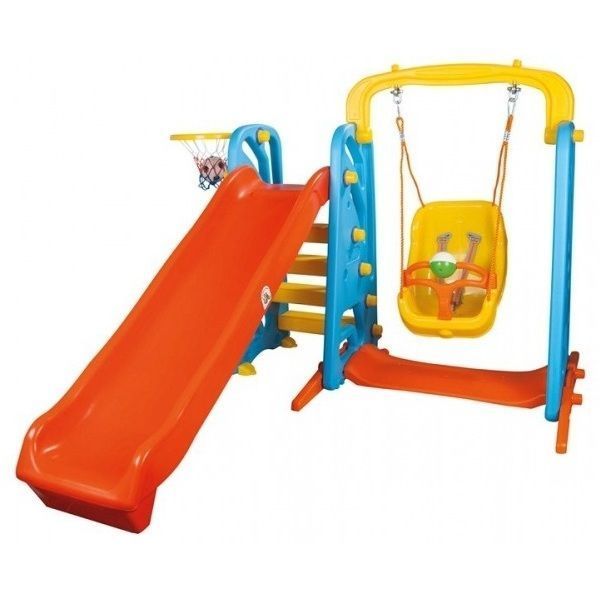 [:ru_RU]Горка с качелями и баскетбольным кольцом Pilsan “Cute” (06141) – это полноценный игровой комплекс. Он предназначен для установки на детские площадки как открытого, так и закрытого типа. Рекомендуется для детей от 3 до 10 лет, при этом максимальный вес ребенка может достигать 50 кг. Игровой комплекс состоит из прочного основания которое можно заполнить песком для большей устойчивости, трех стоек, лестницы с ручками, скатом горки, одиночной качели на поперечине с гибким подвесом и баскетбольного кольца на одной их внешних стоек. Качели Big Swing (06130) входят в комплект, но они легко снимаются и можно установить любой вид качели бренда Pilsan. Высота комплекса в собранном состоянии достигает 1 м 30 см, что не требует наличия высоких потолков в случае его установки в жилом помещении. Ширина в собранном состоянии составляет примерно 2 метра.