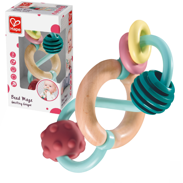 Игрушка соединяет кольцо из гладкого дерева, нежно текстурированная дорожка с символом бесконечности, две резиновые бусины с тиснением и два диска. Отлично подходит для тактильного развития и зрительно-моторной координации, а также для развития мелкой моторики.