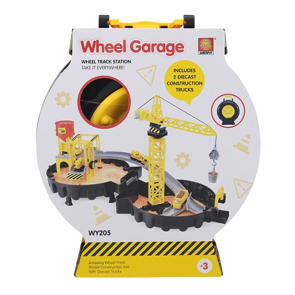 [:ru_RU]Двухуровневый трек “Стройка” понравится всем юным любителям машинок и кранов. Это одновременно гоночный трек и стройка. Высокий кран загружает щебенку на самосвалы, и они везут свой груз дальше. Благодаря подъемнику, грузовики перемещаются с уровня на уровень и двигаются по изогнутой трассе. Трек Wheel Garage помещается в раскладной компактный чемоданчик в виде колеса, который также является его основанием.[trim][:ro_RO]Pista pe două niveluri „Construcție” va atrage toți iubitorii tineri de mașini și macarale. Este atât o pistă de curse, cât și un șantier. O macara înaltă încarcă pietriș pe camioane basculante și își duc sarcina mai departe. Datorită ascensorului, camioanele se deplasează de la nivel la nivel și se deplasează de-a lungul unei piste curbate.